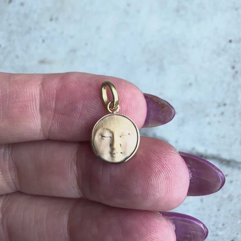 This beautifully carved fossilized mammoth tusk pendant depicts a peaceful man in the moon, with delicate features, closed eyes, and a serene demeanor. The charm is carved out of fossilized mammoth tusk; it is not sourced from an endangered species, but is instead a fossil. The surface of the fossil has a velvety, organic feel to it with beautiful striation within its cream coloring. The face is surrounded by a 14k gold bezel and hangs from an oval bail. The pendant looks perfect on a delicate chain, or in a necklace stack or charm jumble. The tranquil expression on the man’s face is a great talisman to help you remember to breathe!