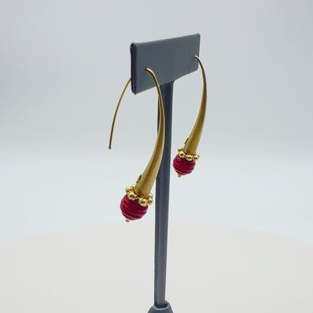 Circa the 1960’s, the striking modernist design of these earrings are a combination of jester hat and Jetsons. An elongated cone descends down from an earring wire and meets a spiral carved red glass bead. The gold has a beautiful Florentine finish, and the bead is topped with a repeating motif of gold balls and wires that creates a whimsical and space age earring.