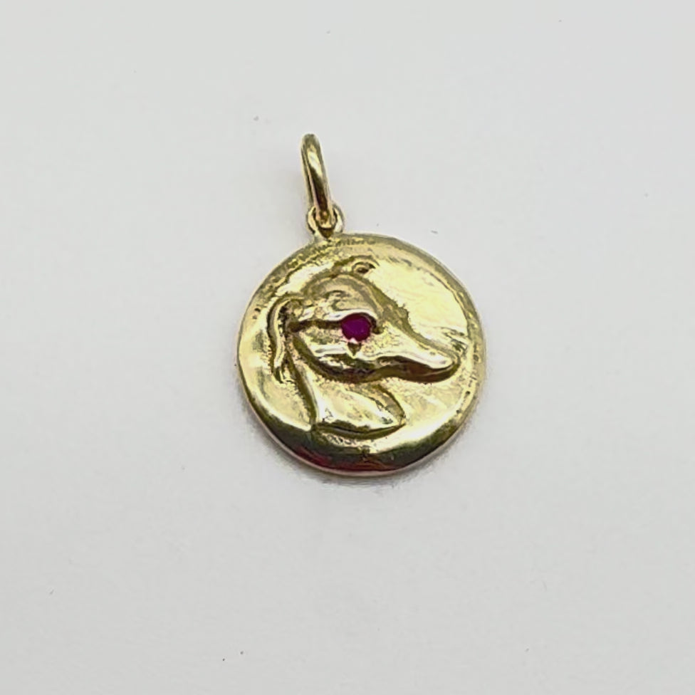 This is a precious 14k gold medallion charm from Kirsten’s Corner signature “Cute as a Button” collection. It's handcrafted from a Victorian-era button and features what looks like a whippet or greyhound dog. The face of the dog has striking ruby eyes that offer a nice touch of color to the 14k golden backdrop. The back of the charm is smooth and flat. The ruby measures 1 mm and the entire pedant has a 14.5 mm diameter. This piece has a solid weight, 5 grams, allowing it to hang well.