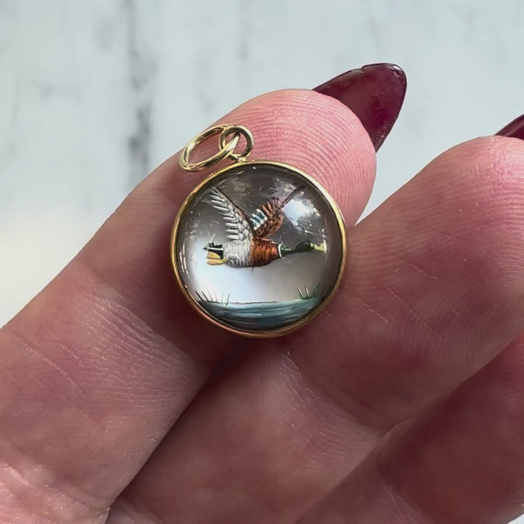 At Kirsten’s Corner we always find a bit of magic in the reverse-painted Essex crystal items. They are made with a painstaking technique that involves carving on the back of the crystal and then delicately painting an image so that a three dimensional form is captured within the stone. In this charm, we see a mallard duck flying above a blue pond with tall grass. The bird has beautiful details in its wings, green head, and tiny eye. The crystal is backed in Mother of Pearl, adding another layer of luminous shine. The reference to snow globes is ever present and taps into childhood magic.