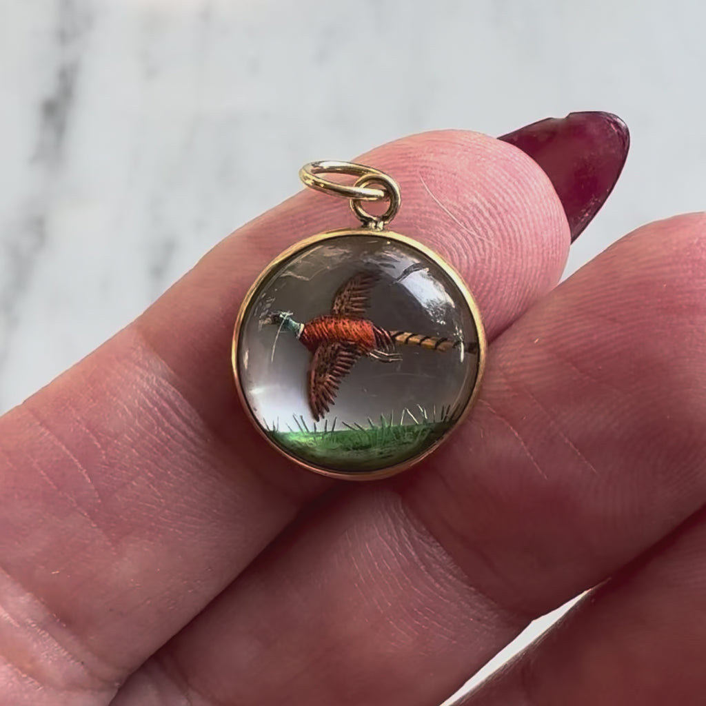 At Kirsten’s Corner we always find a bit of magic in the reverse-painted Essex crystal items. They are made with a painstaking technique that involves carving on the back of the crystal and then delicately painting an image so that a three dimensional form is captured within the stone. In this charm, we see a pheasant flying above a grassy field. The bird has beautiful details, with each feather individually carved out. The ring around the pheasant’s neck makes a tiny added detail and indicates that this is a ringneck pheasant, and a lovely plume of golden feathers on the bird’s backside shows its grace. The crystal is backed in Mother of Pearl, adding another layer of luminous shine. The reference to snow globes is ever present and taps into childhood magic.