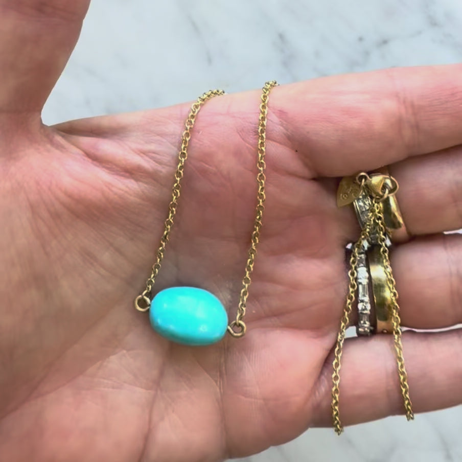 The turquoise bead measures 5/8” x 7/16”. The chain is 17.5” long and 1.75 mm wide. The necklace weighs 7.5 grams. Marked Me & Ro and 18k.