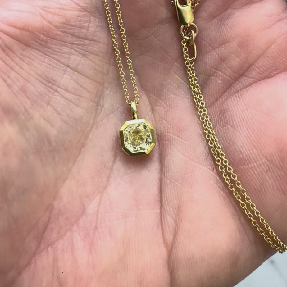 This beautiful fancy light yellow diamond was repurposed from an antique ring. Its octagonal cut is an unusual and beautiful shape for a diamond that is not often seen. The stone has a lovely, pale, fancy yellow hue that is complemented by the warmth of the 18k gold bezel that holds it. The bezel frames the face of the diamond and is form fitting as it drops down around the rest of the stone, opening up again at the back of the bezel to reveal more of the diamond’s stunning facets. The bezel has an integrated bail that balances the pendant nicely and attaches to a delicate 18” 14k gold chain.