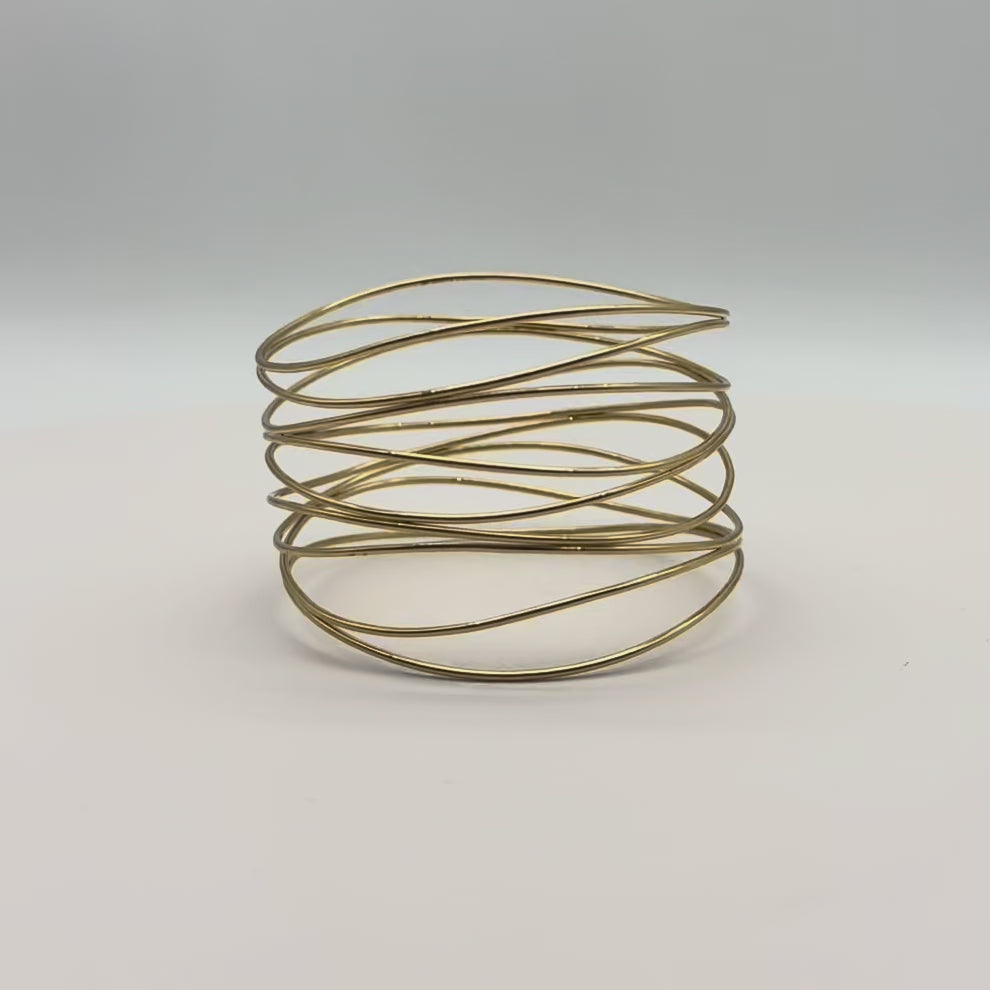 This 18k gold Tiffany & Co. bracelet was designed by Elsa Peretti and is composed of nine wire bands that connect seamlessly in a fluid form reminiscent of ocean waves.  The bands are flexible and somewhat collapsable, allowing the bracelet a bit of movement, and the wavy bands appear to undulate as they spiral up the wrist. Though the bands are delicate, the bracelet’s width gives it presence. Known for her love of the natural world and designs inspired by nature, Elsa Peretti captures the essence of the sea in this iconic bracelet.