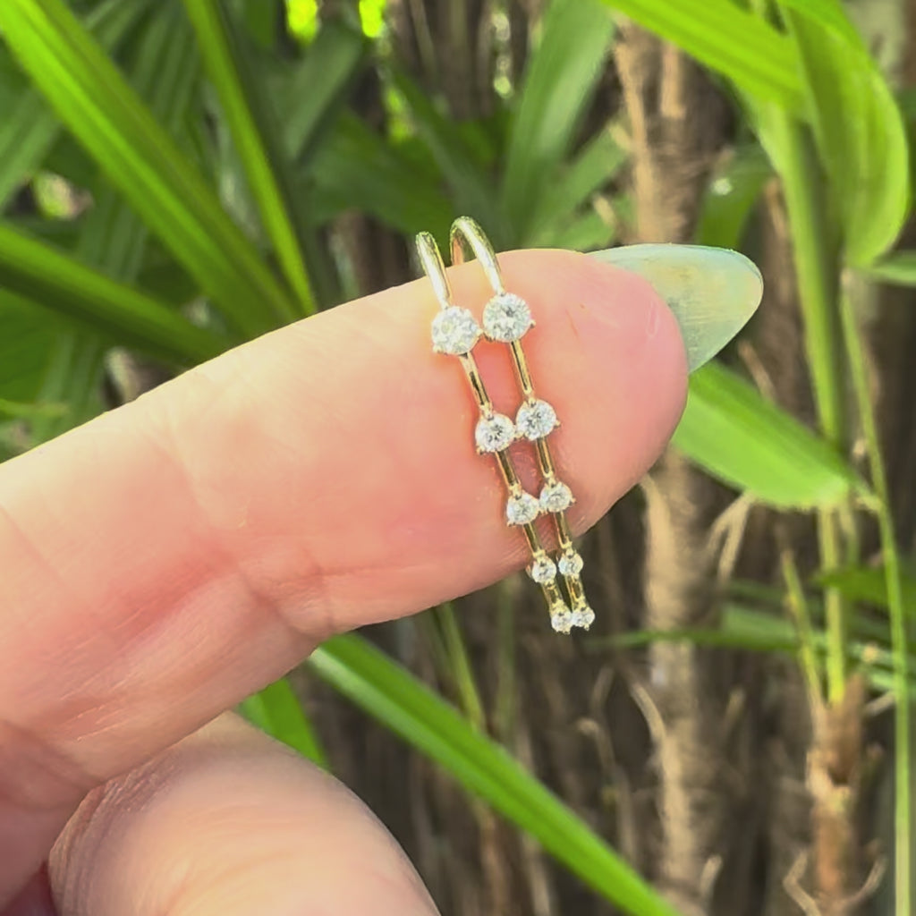 A great contemporary pair of earrings, with a clean look perfect for everyday wear. The 14k gold earrings consist of a simple bended wire that goes through the ear, with a row of diamonds prong set along the outer wire, graduating in size. The first three diamonds are set with three prongs, while the final tiny two diamonds are bead set with two prongs. The diamonds’ setting are integrated nicely into the design to accommodate the diamonds as if they were part of the gold. The earrings have a contemporary and trendy look, with a cool modernist design.