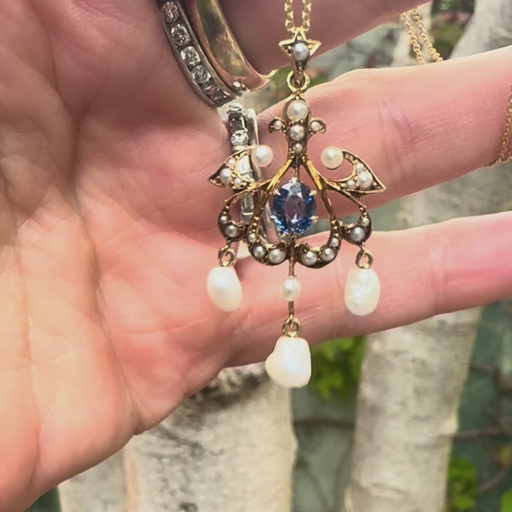 A classic design motif from the Edwardian era, this 14k gold pendant has flowing lines and delicate work. In the center, a natural sapphire with a gorgeous shade of blue is prong set with six talon prongs. It is surrounded by a symmetrical design with cascading lines that are embellished with seed pearls. Three Mississippi River pearls, elongated and organic in shape, dangle at the bottom of the pendant. At the top, the original bail is adorned with a bead set pearl and is incorporated into the pendant’s design. The antique gold has a beautiful patina and the pendant has lovely movement. A handmade piece circa 1910. It hangs from a delicate 14k gold Italian belcher link chain.