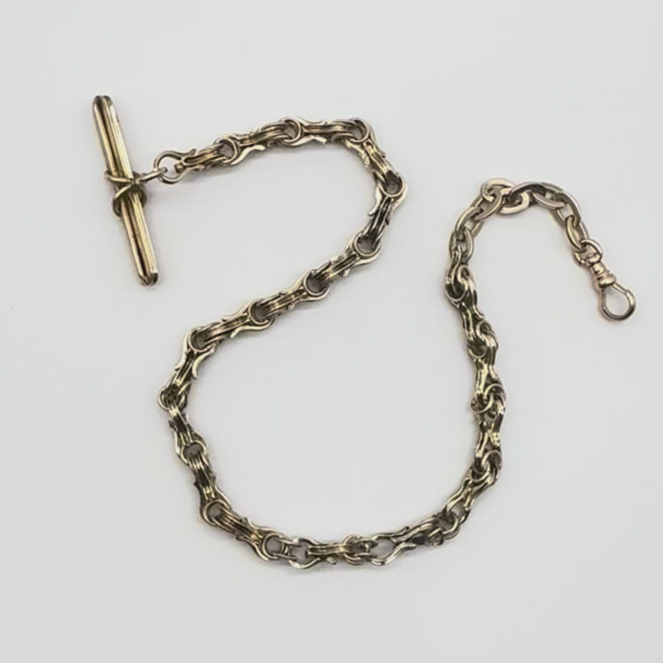 This is a beautiful and complex Victorian watch chain in 14k gold. The intricate link of the chain is reminiscent of a bike chain and pivots and rotates in more than one direction. It is almost like a fidget spinner and it invites you to study it and play with it. On one end is a section of oval link chain that culminates with a dog clip. On the other end is a T-bar, sculptural and textured, with two rings that fold over to wrap around it.