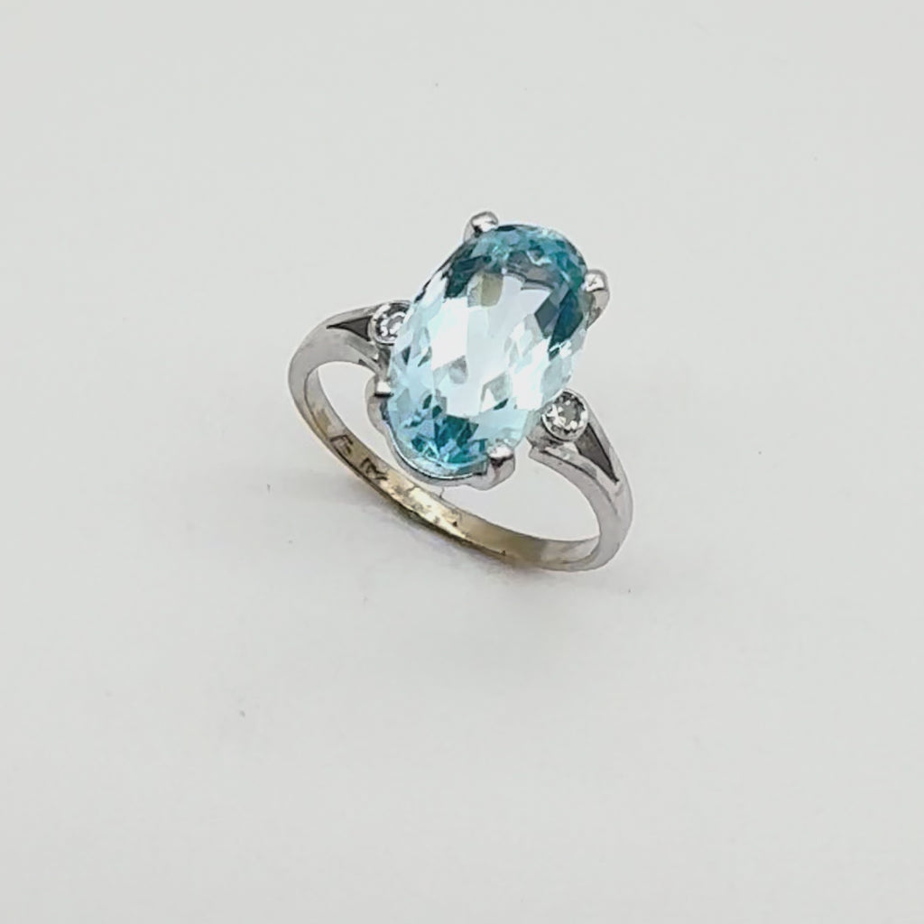 The ring’s natural aquamarine measures 7.9 x 5.5 x 3.15 mm and has a carat weight of 3.5. The natural single cut diamonds measure 2.25 mm each, for a combined TCW of .05 carats. The diamonds are VS1 in clarity and G-H in color.