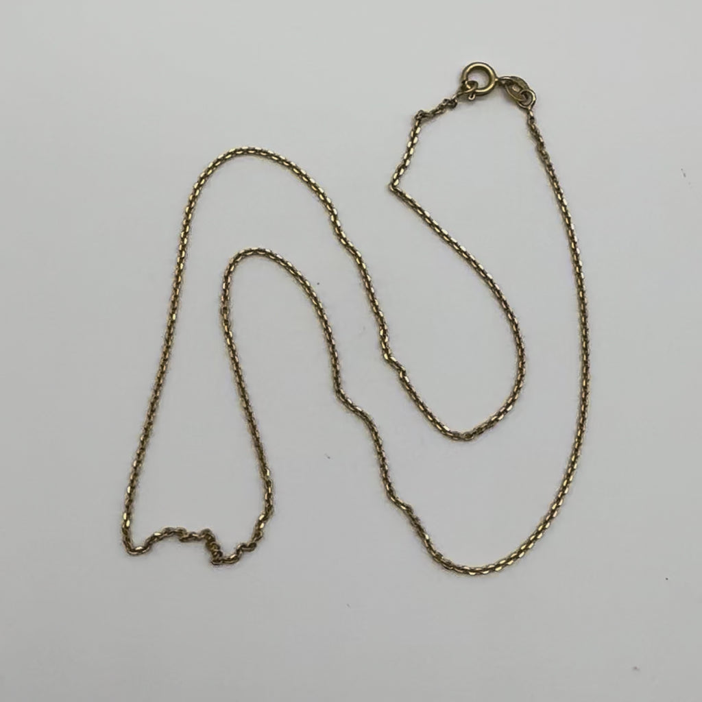 The chain is 18” long and weighs 3.65 grams. It has a spring ring clasp and connects to a 3 mm jump ring. Marked as 18k and Italian. Shown with a pendant to give reference to how it looks as a chain for a pendant.
